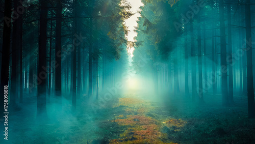 Obraz premium A serene path winds through a lush forest filled with tall evergreen trees. Soft morning light breaks through the mist, creating a magical atmosphere