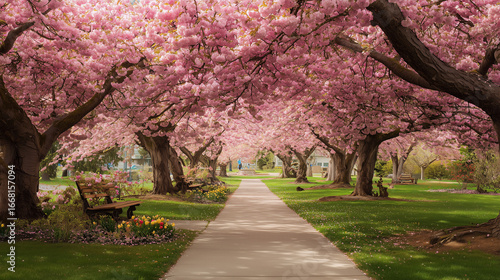 Naklejka premium A serene pathway lined with cherry blossom trees in full bloom, their pink flowers forming a breathtaking canopy over the walkway, with benches and tulips adding charm to the peaceful scene.