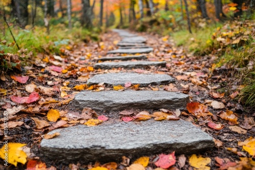 © DuangphonKPR, Obraz premium A serene pathway lined with stone slabs and colorful autumn leaves, surrounded by trees in a tranquil forest setting.