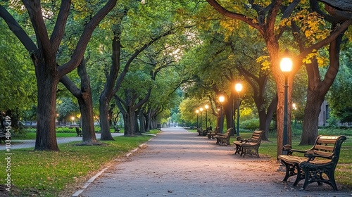 © Hungarian, Fototapeta premium A Serene Pathway Through a Canopy of Trees with Benches and Lampposts