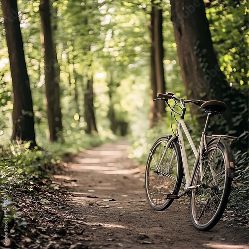 Fototapeta premium A serene pathway through the lush green forest, featuring a parked vintage bicycle inviting outdoor adventures.