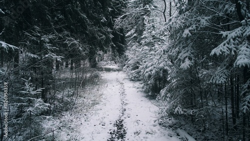 Naklejka premium A serene pathway winds through a winter forest in Alaska, blanketed in fresh snow. Tall evergreen trees frame the trail, creating a peaceful and cold atmosphere