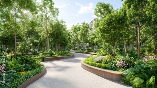 Obraz premium A serene pathway winds through lush greenery and vibrant flowers, creating a...