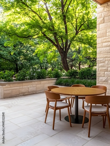 © Mohan, Obraz premium A serene patio scene with a round table and chairs, nestled amongst lush greenery under a sprawling tree
