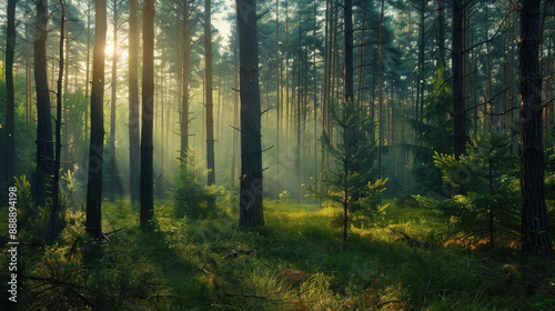 Fototapeta premium A serene pine forest with sunlight filtering through the tall trees