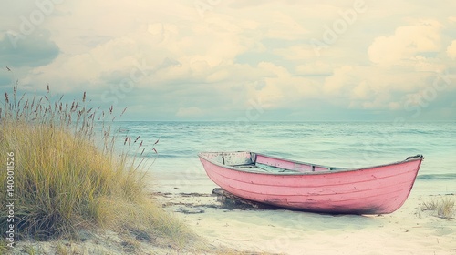 © Anak, Fototapeta premium A serene pink boat rests on a tranquil beach.
