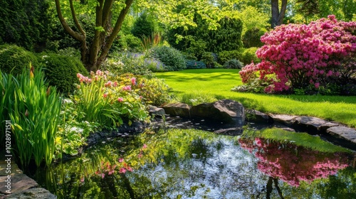 Obraz premium A Serene Pond in a Lush Green Garden with Pink Flowers