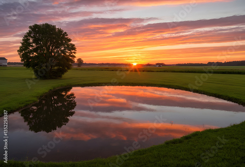 © Creative Vault, Obraz premium A serene pond on a farm, its surface reflecting the warm glow of a sunrise sky over the horizon.