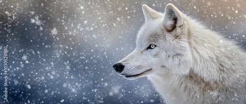 © BerkahStock, Fototapeta premium A serene portrait of a white wolf amidst falling snowflakes in a wintry landscape.