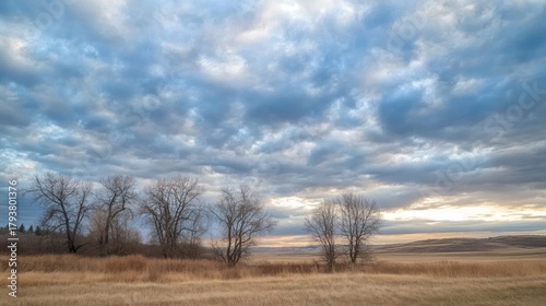 Fototapeta premium a serene prairie landscape featuring bare trees against a dramatic, cloudy sky, capturing the tranquil beauty of the open plains at dusk
