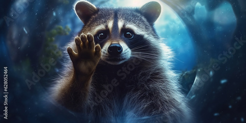 © artefacti, Obraz premium A Serene Raccoon Gazing into a Blue Clear Crystal Ball, Enveloped in Magic AI generated