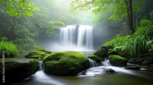 Obraz premium A serene rainforest waterfall cascading down moss-covered rocks, surrounded...