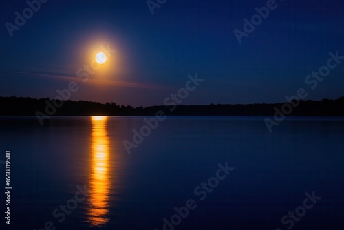 © Oleg, Obraz premium A Serene Reflection of the Moon on a Calm Lake