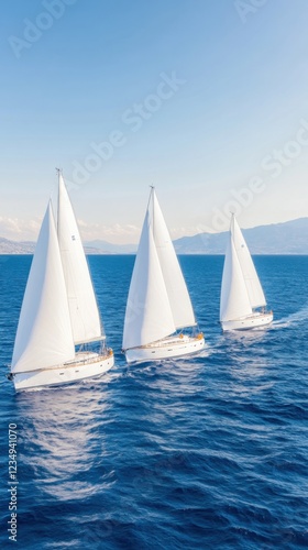 © Sergey, Fototapeta premium A serene regatta of three sailing ships with white sails gliding over a tranquil blue sea under a clear sky.