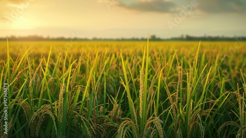 Fototapeta premium A serene rice paddy field with golden grains ready for harvest.