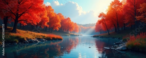 Naklejka premium A serene river flows gently through a forest of crimson and orange trees...