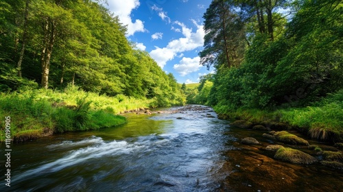© Levan, Obraz premium A serene river flows through a lush forest beneath a bright blue sky, creating a tranquil scene. This river surrounded by nature offers a peaceful escape with ample copy space.