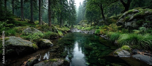 © Mega, Obraz premium A serene river flows through a lush, forested landscape with reflections