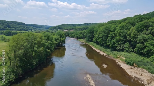 © Rastika, Fototapeta premium A serene river flows through a lush green landscape under a bright blue sky