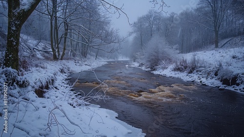 Fototapeta premium A serene river flows through a snow-covered forest, creating a winter...