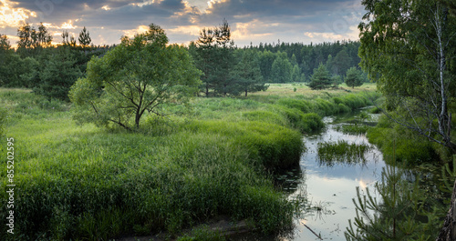 © Sergei, Obraz premium A serene river flows through a verdant meadow surrounded by tall trees, illuminated by the warm glow of the setting sun.