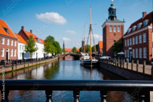 Fototapeta premium A serene river flows through the heart of the city, surrounded by towering...