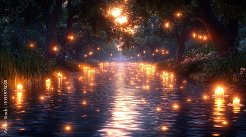 © Edo, Naklejka premium A serene river illuminated by floating candles in a lush forest.