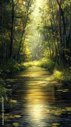 © imlane, Obraz premium A serene river in the forest, surrounded by tall trees and reeds