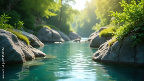 © ikhsan, Naklejka premium A serene river scene, featuring smooth grey rocks lining the tranquil waterway, surrounded by lush greenery.
