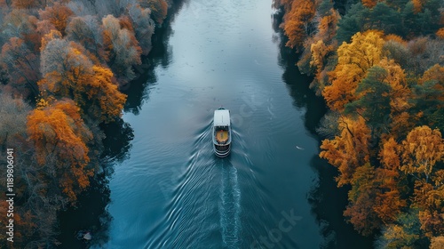 © PICK YOUR POV, Fototapeta premium A serene river scene with a boat navigating through vibrant autumn foliage.