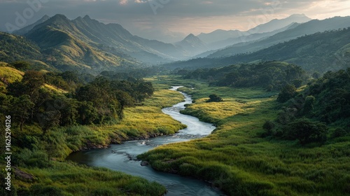 Fototapeta premium A serene river winds through a lush green valley scenic landscape with misty...