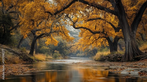 © hinan muntako, Obraz premium A serene riverscape with golden autumn foliage creating a mesmerizing scene