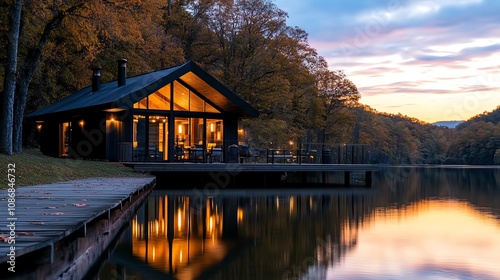 © Moviebirth, Fototapeta premium A serene riverside lodge surrounded by autumnal trees