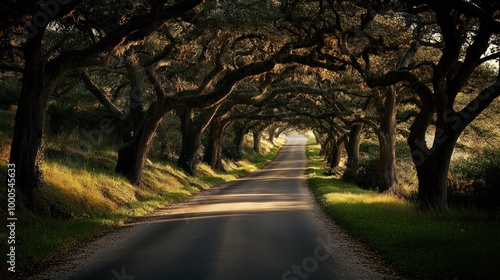 © BerkahStock, Naklejka premium A serene road lined with majestic trees, inviting exploration and tranquility.