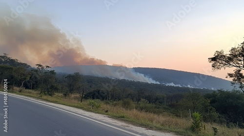 © NafisaNajmin, Naklejka premium A serene road stretches through a dense forest of tall pine trees under a clear sky.
