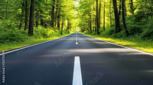 Obraz premium A serene road stretches through a lush green forest, inviting exploration and...