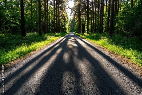Naklejka premium A serene road surrounded by tall trees, casting dramatic shadows in golden...
