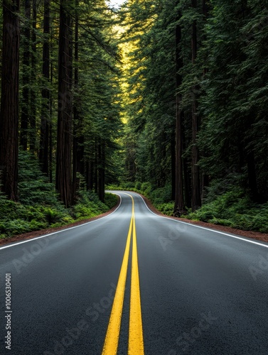 Fototapeta premium A serene road winding through a dense forest, lined with towering trees,...
