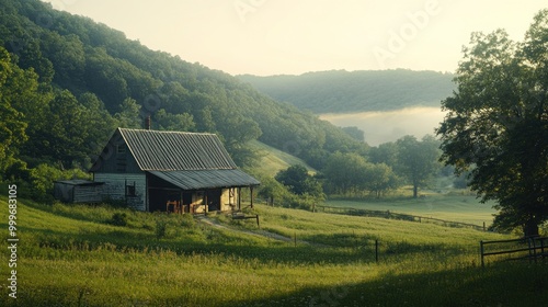 © BerkahStock, Obraz premium A serene rural landscape featuring a rustic house amidst rolling hills and morning mist.