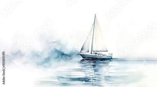 © Terablete, Fototapeta premium A serene sailboat drifting through calm waters under a hazy sky in a watercolor style