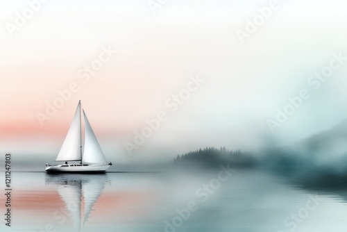 Fototapeta premium A serene sailboat glides silently across calm waters at dawn. Light fog envelops the scene, while soft hues of pink and blue create a peaceful atmosphere, hinting at a new day
