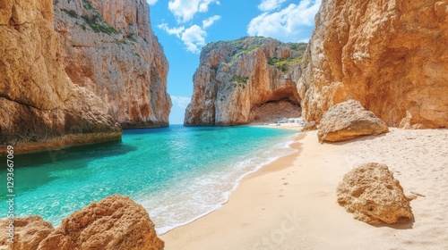 Fototapeta premium A serene sandy beach borders a vibrant blue ocean, framed by a rugged rocky...