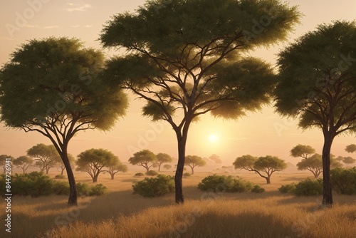 Obraz premium A serene savannah with acacia trees and a golden sunset