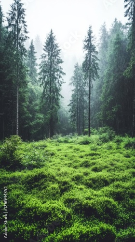 © Sergey, Fototapeta premium A serene Scandinavian forest scene with tall trees and lush green moss, creating a tranquil and misty atmosphere.