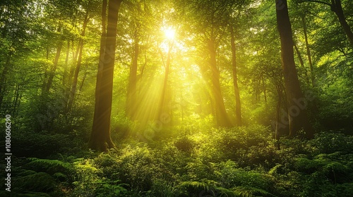 Fototapeta premium A serene scene capturing sunlight streaming through a dense forest canopy,...