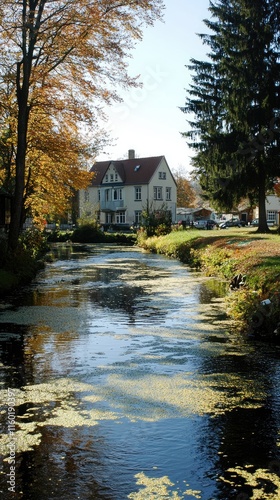 Obraz premium A serene scene featuring a house by a calm stream surrounded by autumn foliage.