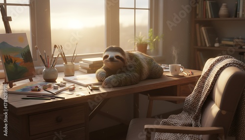 © gurem, Naklejka premium A serene scene featuring a sloth relaxing on a wooden desk, surrounded by painting supplies and a steaming cup. Sunlight streams through the window