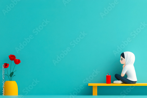 © F-STUDIO, Obraz premium A serene scene featuring a young girl in a hijab sitting on a yellow bench, with a red drink and flowers against a turquoise background.