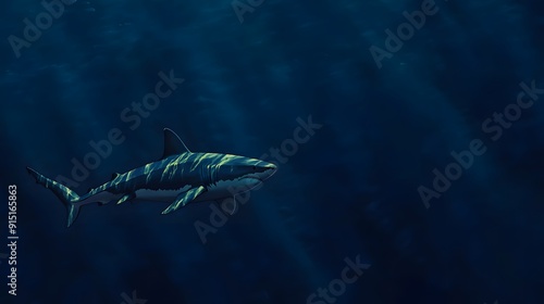 Naklejka premium 69. "A serene scene of a great white shark gliding through the deep blue ocean.