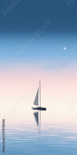 Fototapeta premium A serene scene of a lone sailboat gliding on calm waters under a pastel sky...